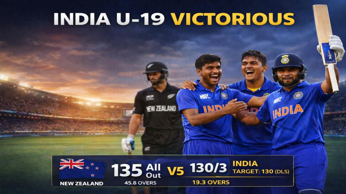 India Under-19 continued their dominant run in the World Cup with a convincing 7-wicket victory over New Zealand Under-19 in a rain-affected contest decided under the Duckworth–Lewis–Stern (DLS) method. The comprehensive win further cements India's position as strong title contenders.